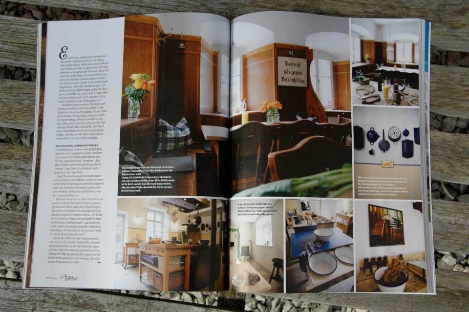 Ja – eine gelungene Denkmalsanierung ist eine Familienleistung. Wir haben angestoßen, dies zu würdigen. Mit Kultusminister Dr. Heubisch (links) und den 2 Söhnen, die an diesem Tag – offiziell vom Unterricht befreit – keine Exen schreiben mussten. So schön kann Denkmalpflege sein. Rechts die Veröffentlichung im Magazin „Servus“ Heft Juni 2013.