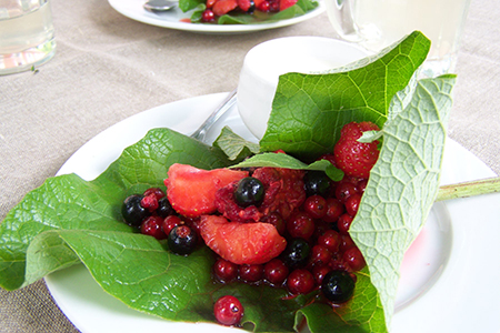 kraeuterwanderung_juniBei sanftem Nieselregen (original irisches Klima) sammelten wir auf der Deinsdorfer Hochfläche die Johanniskräuter. Zum Menü unter dem großen Ahorn im Garten der Oedmühle wurden wir dann mit strahlendem Sonnenschein belohnt. Blick aufs Dessert: Rote Beeren mariniert in Hollersirup mit frischen Minzblättchen & Mädesüßsahne. Serviert auf Blatt der großen Klette.